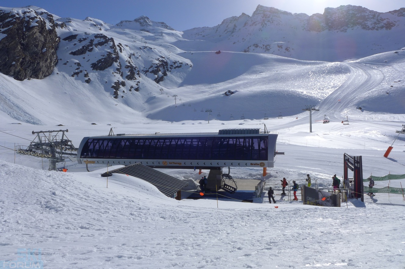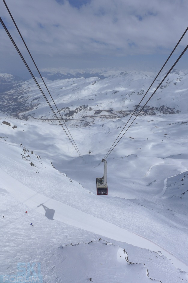 Premessa: Les 3 Vallees sono il comprensorio sci ai piedi più grande al mondo. Per raggiungerlo dall'Italia la strada più comoda è via tunnel del Frejus + cabinovia di Orelle. Da Torino in poco più di un'ora di comoda autostrada si è ai parcheggi. La cabinovia 3 Vallees Express ha preso quindi il nome de "La porta (definiamola quasi italiana) per Les Trois Valles". Ci sono circa 5 km di linea e il dislivello è sostenuto: si parte da 888 m slm e si arriva in circa 15 minuti a 2360 m slm. Si parte che è primavera e ci si immerge nelle nevi invernali della conca su cui si sviluppano gli impianti di Orelle.