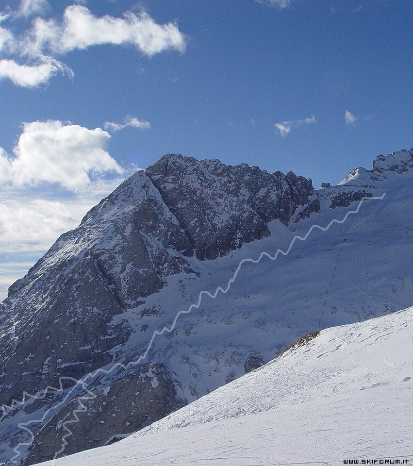 Se si gira a destra si prende un valloncello il quale termina su un ripido salto, pericoloso con neve non assestata.