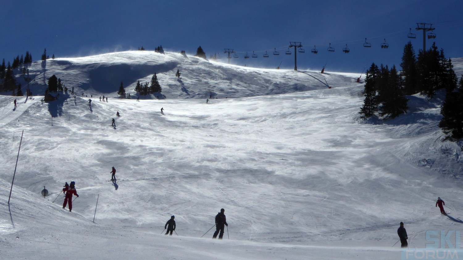 Purtroppo per collegarsi tra le due estremità della skiarea è obbligatorio passare per una delle seggiovie in altitudine. Salgo sulla seggiovia Crêtes ma la situazione di vento frontale è del tutto inaccettabile per riuscire a sciare decentemente, motivo per il quale non viene certamente voglia di ripetere le piste che ritornano alla base della seggiovia, che sarebbero probabilmente le più interessanti del comprensorio: