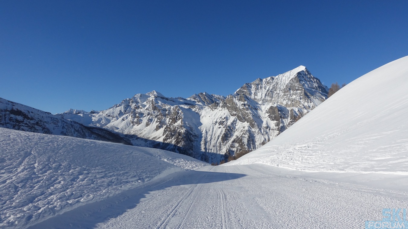 La pista di rientro a valle a me è piaciuta! Dall’Alpe Ciamporino fino alla Casa Rossa si scia su una bella stradina, in alcuni tratti stretta, ma piacevole soprattutto nel tratto iniziale e centrale dove passa tra le rocce e regala una meravigliosa vista sul Monte Leone.