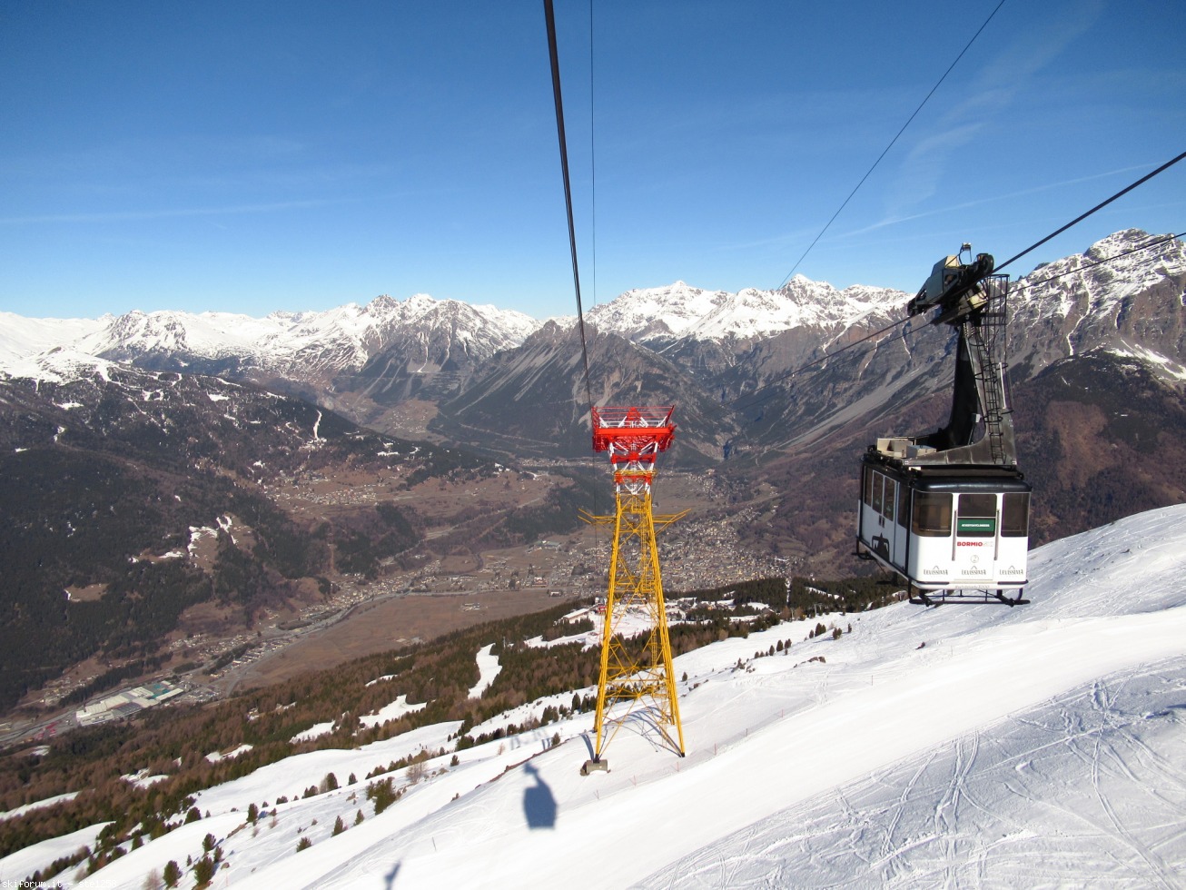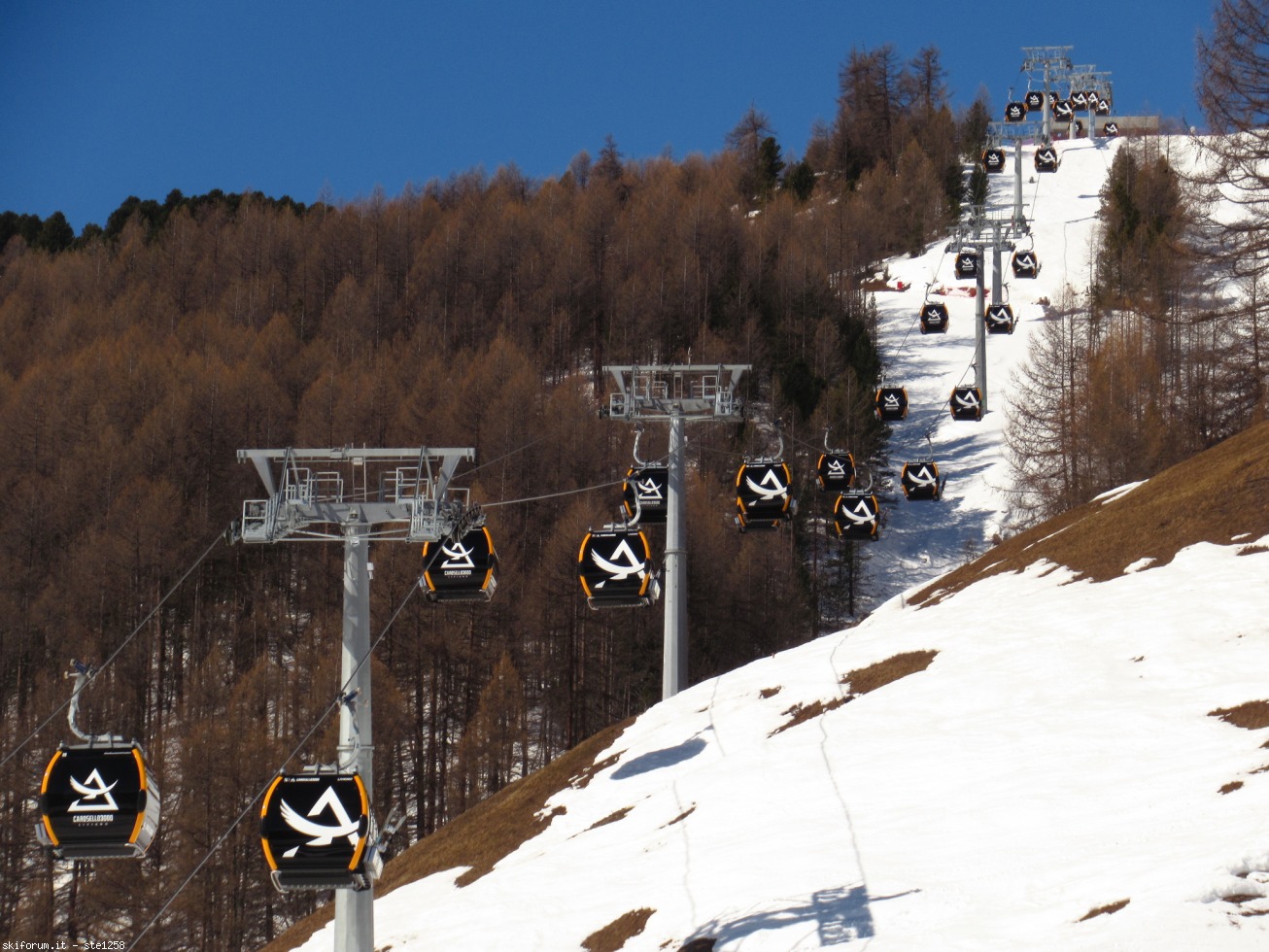 Ci spostiamo subito di là sfruttando la nuova navetta "espressa" di collegamento tra i 2 versanti, in aggiunta alle solite 3 linee bus urbane. La navetta però porta direttamente davanti agli impianti, sia lato Carosello che Mottolino, a differenza dei bus che si fermano lungo la strada. E di là prendiamo subito il "nuovo mostro": 3200 persone orarie e 6 m/s di velocità, code dimenticate e 900 m di dislivello in 10 minuti... la vecchia Agudio non mi manca.