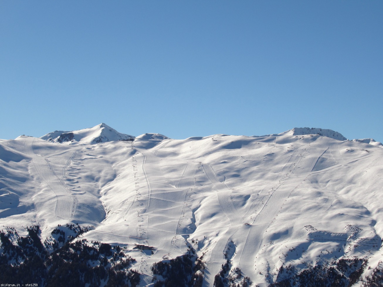 Seggiovia Fontane (con i piloni alzati, finalmente... non si rischia più di decapitare qualche sciatore che passa sotto) con la nuova variante di collegamento da Valandrea, in primo piano, che mi dicono essere una novità di questa stagione, in effetti non l'avevo mai vista.
