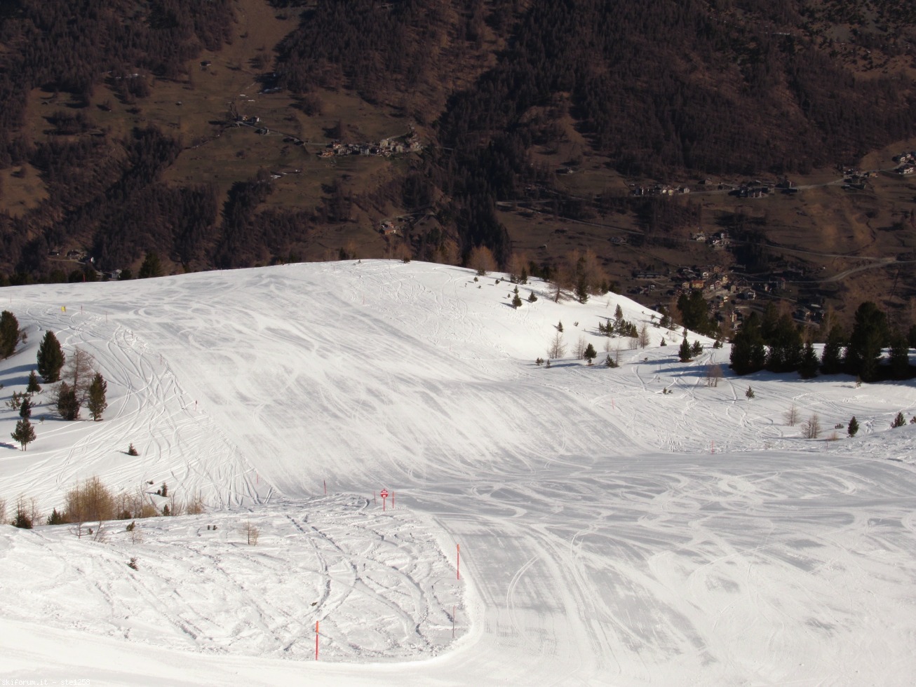 Pista Femminile bassa, adesso rinominata Blesaccia (dite a quelli della Carosello di mettere i nomi delle piste sulla mappa... il disegno muto così com'è adesso è incomprensibile!), scende fino in paese con una bella vista sul biscione: