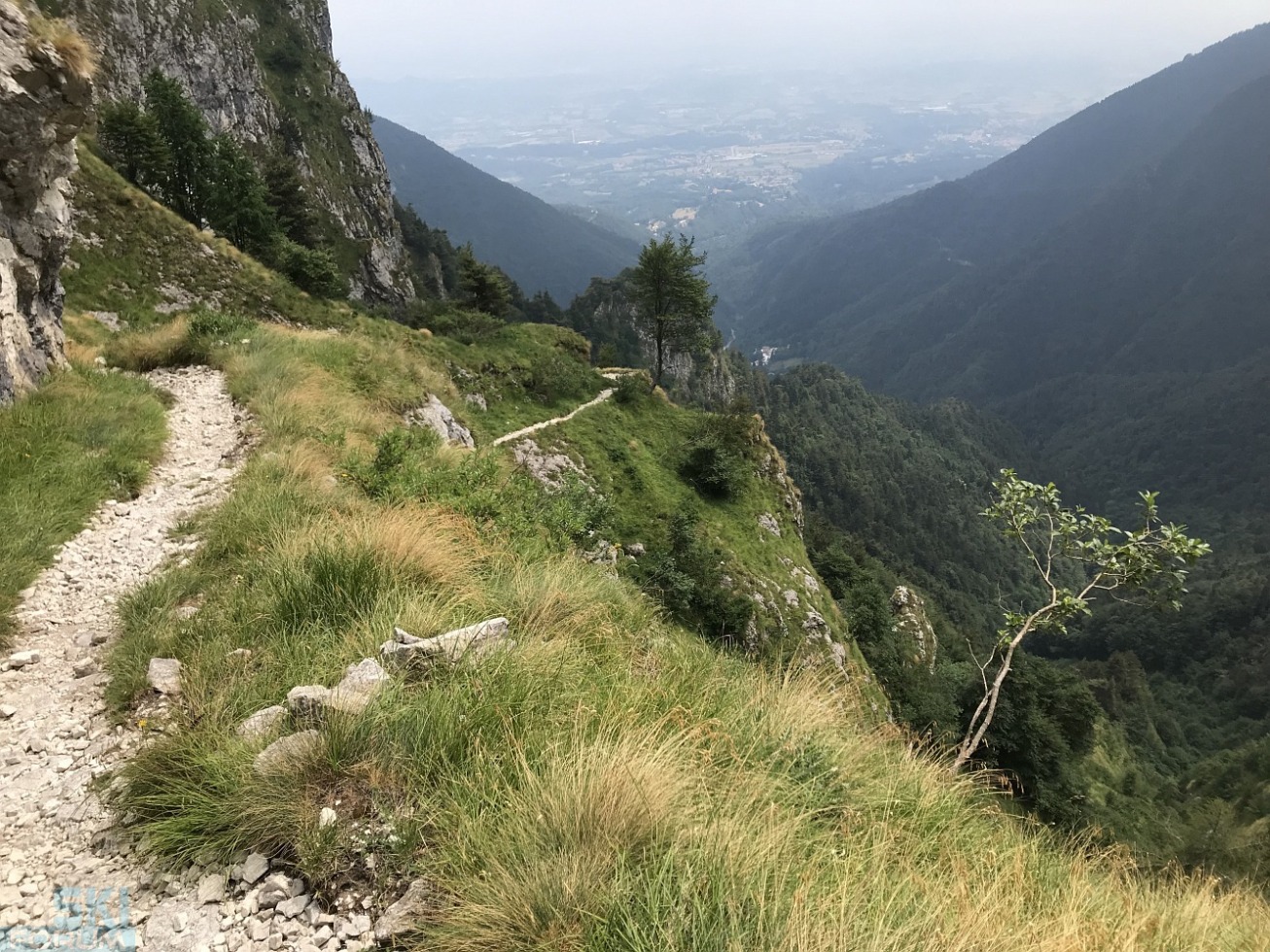 Dopo circa 20 minuti si incontra il bivio per il sentiero di avvicinamento alla ferrata e da questo punto la musica cambia radicalmente. L'avvicinamento è un ripido sentiero che si inerpica per il bosco e che in circa 1 ora porta all'attacco. Per fortuna questo "spacca gambe" è tutto all'ombra mentre la ferrata è tutta al sole... Brusai, la parola che compone il nome della ferrata in dialetto significa "bruciati" e questo fa capire molte cose.