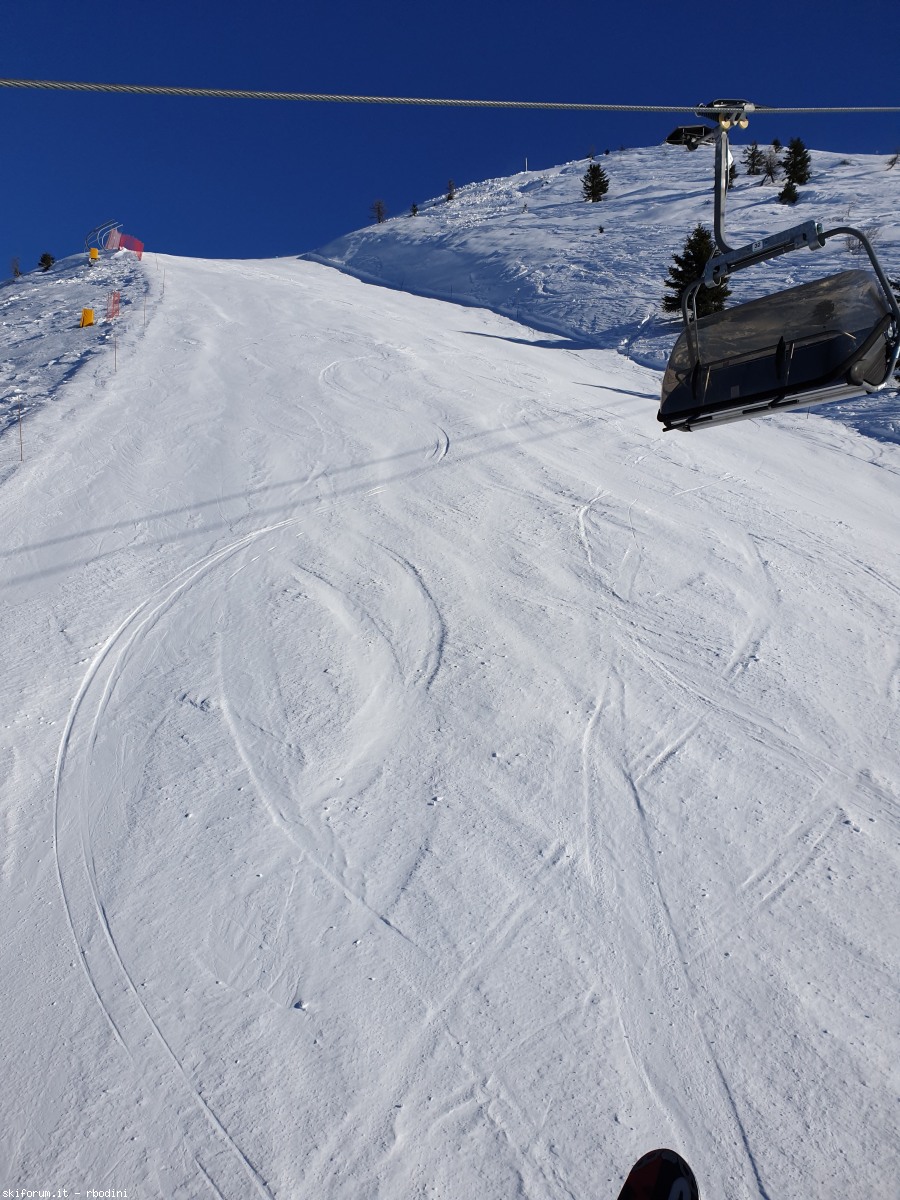 Non ho mai capito perché, ma sulla pista più bella servita dalla seggiovia più veloce c’è sempre pochissima gente. E anche questo sabato 28 dicembre non fa eccezione… La pista in questione è la Gran Pista servita dalla seggiovia Rocce Rosse: 3 km e mezzo di lunghezza, oltre 800 m di dislivello, con un tracciato vario che alterna muri a tratti scorrevoli molto divertenti. Una pista che puoi fare e rifare senza annoiarti, e se hai due ore a disposizione te la spari a ripetizione e torni a casa soddisfatto.