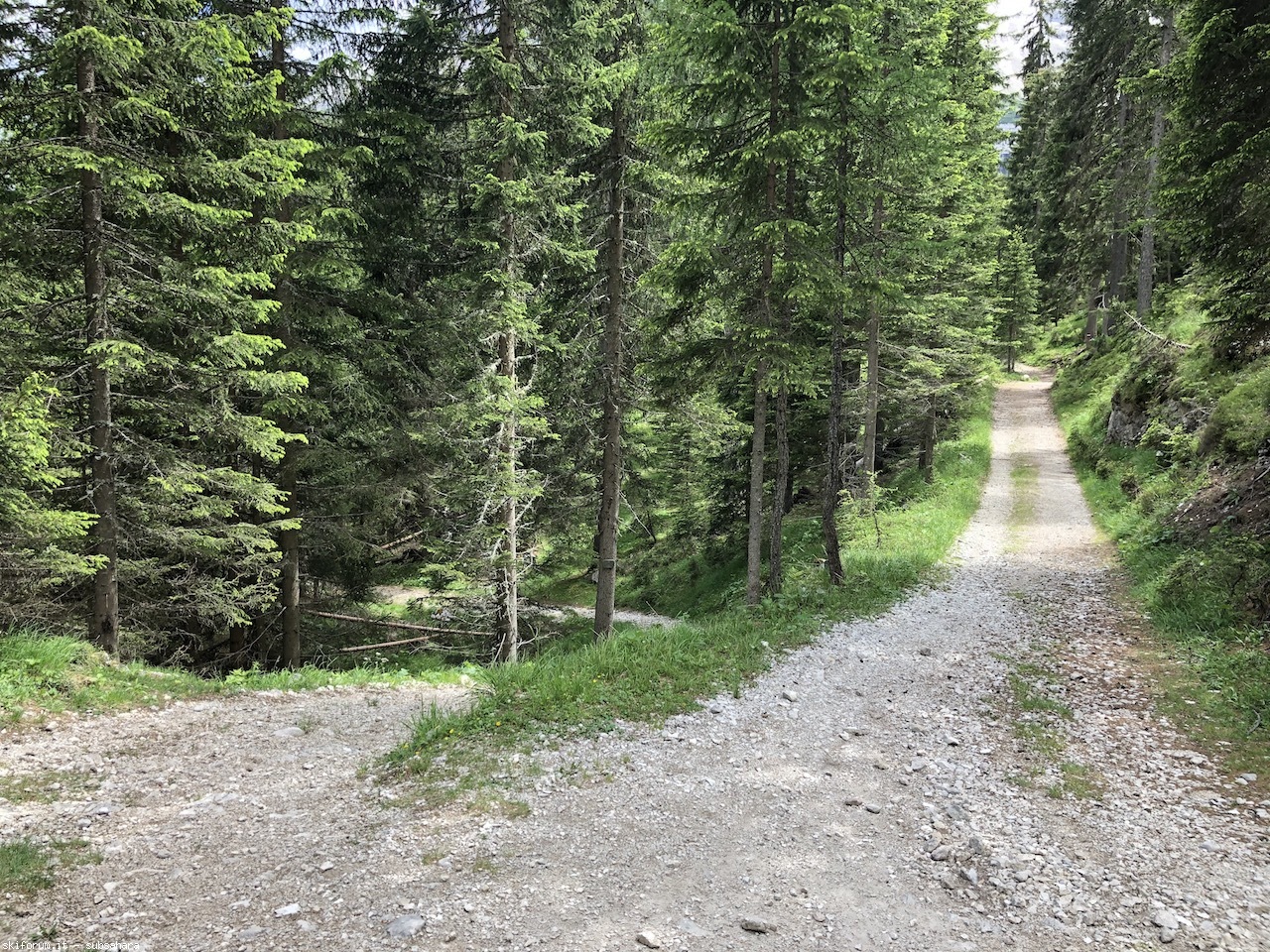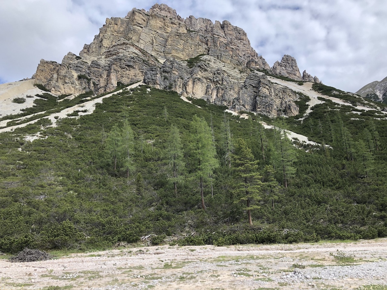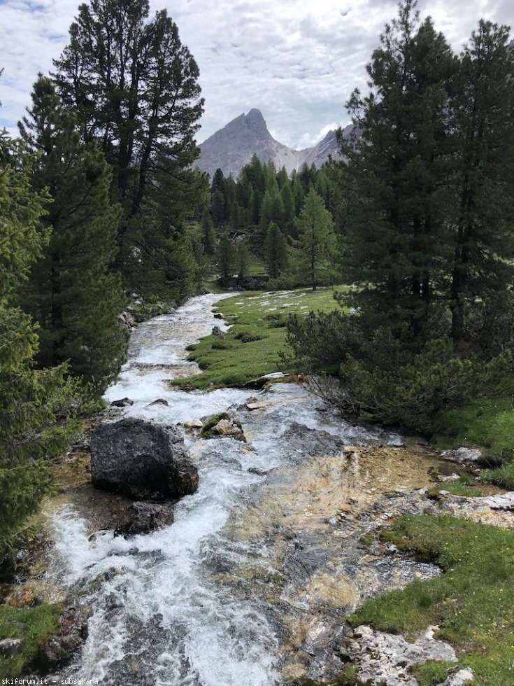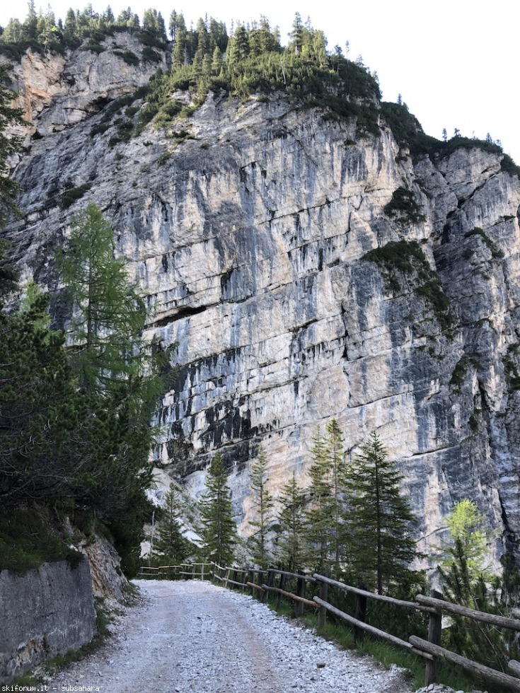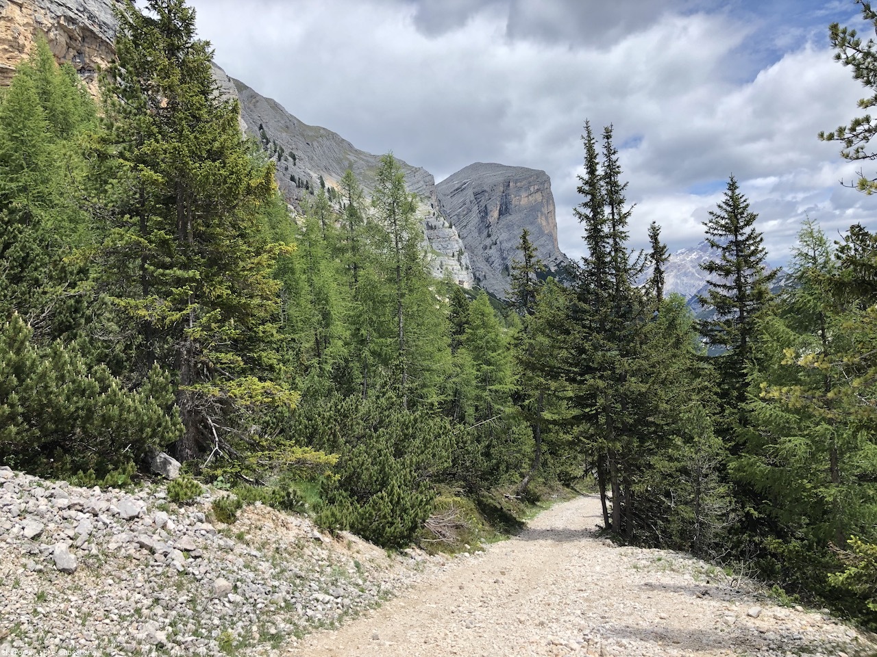 Per raggiungerlo occorre scendere di oltre 400 m di dislivello nello spazio di circa 3 km. Fare i conti è facile: la forestale ha una pendenza media di circa il 15%, e in più non è certo un tavolo da biliardo. Mentre scendevo ho incrociato una jeep che saliva al Fodara Vedla o al Sennes faticando non poco; immagino che per un ciclista, specie se della domenica, la fatica e l’impegno richiesti in questo tratto non siano trascurabili. Comunque la forestale nella parte alta è doppiata da un sentiero per pedoni che taglia qualche tornante.
