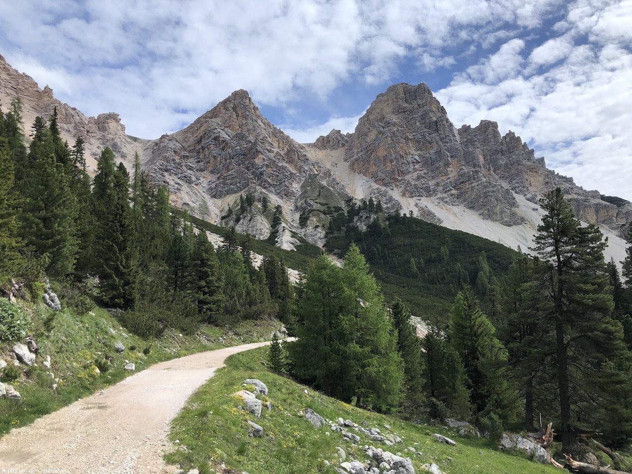 Ad ogni modo, giro a sinistra e percorro l’amena forestale che sale a tornanti offrendo belle viste su Croda Rossa e Croda del Becco