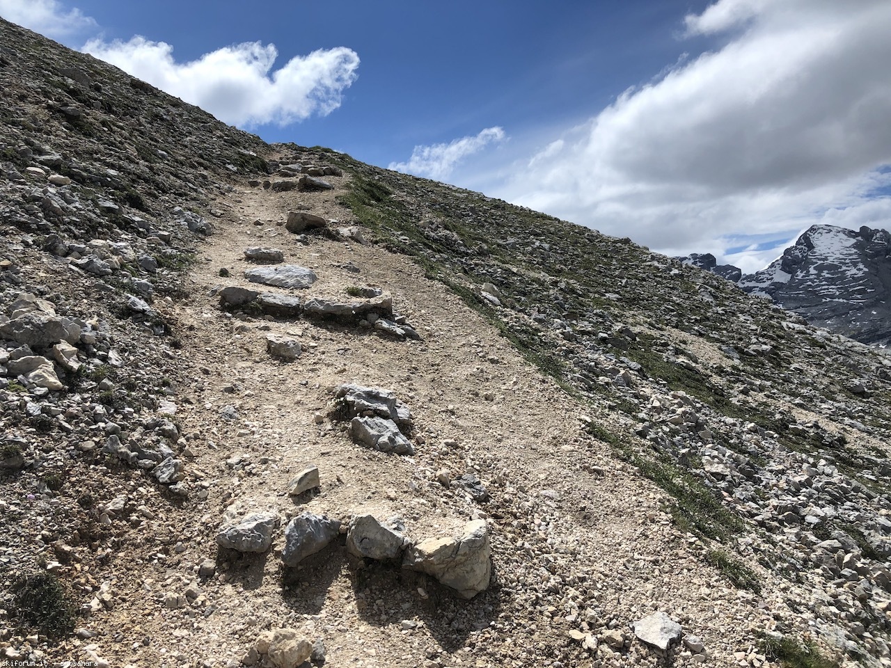 Giungo a una forcella a quota 2565 m slm, in corrispondenza della quale si diparte dal 418 la traccia che porta in vetta. La forcella ospitava una postazione per mitragliatrice dell’esercito imperial-regio, a protezione della Fanessperre, lo sbarramento di Fanes. Quest’ultimo correva (credo) sulla linea Lagazuoi - Cime di Fanes - Ciaval - Furcia Rossa - Vallon Bianco, e fronteggiava le dirimpettaie Tofane