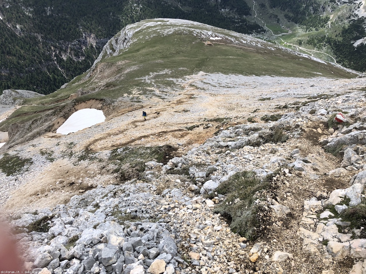 Due immagini dedicate alla forcella Camin (2395 m slm), tra Camin e Col Bechei. Questa forcella l’ho fotografata durante il corso dell’escursione un milione di volte: da oriente poco dopo essere partito, da occidente adesso, da sopra più tardi
