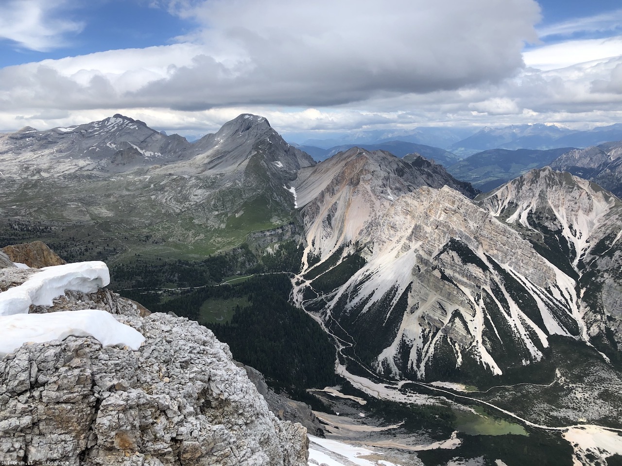 Si vede anche in centro foto il rifugio Gran Fanes (che sorge appunto nel bel mezzo dell’alpe di Fanes Grande, a sud del passo di Limo, mentre a nord di quest’ultimo si trova Fanes Piccolo), e la sterrata che scavalcando l’innocuo Passo dell’Acqua (Ju da l’Ega, anch’esso sullo spartiacque Adige - Piave) porta a Capanna Alpina.