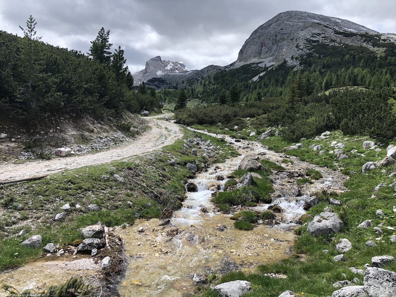 Prendo a sinistra e passo il ponticello sopra il rio di San Vigilio (sullo sfondo… sì, sono proprio loro: monte Camin e omonima forcella