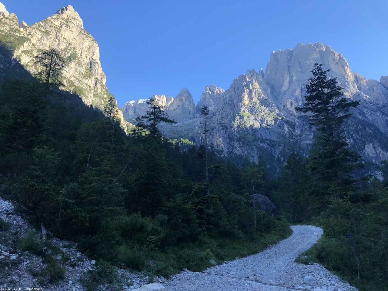 A sinistra c’è l’imponente Cima dei Lastei, a destra la Pala del Rifugio sormontata dall’elegante Sass d’Ortiga, dritto davanti a me - ancora lontani, alla testata della valle - Colle Canali, la bella piramide dell’Alberghetto (con tanto di slanciato “ditino”), le Cime del Coro