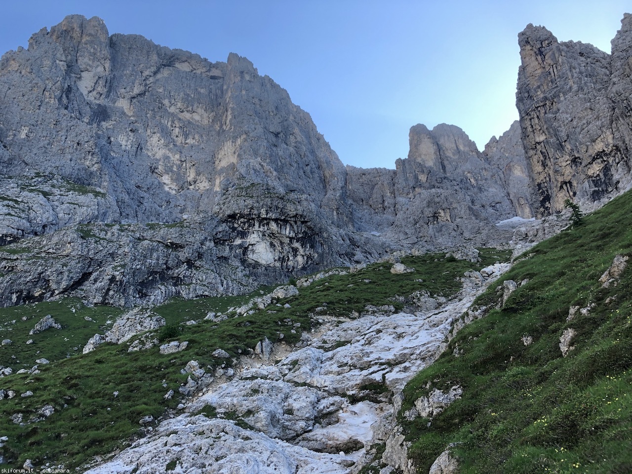 Quindi vo dritto seguendo il sentiero 707, che passerà sotto le pareti del Coro, dell’Alberghetto e di Colle Canali prima di imboccare il breve canale che porta al passo