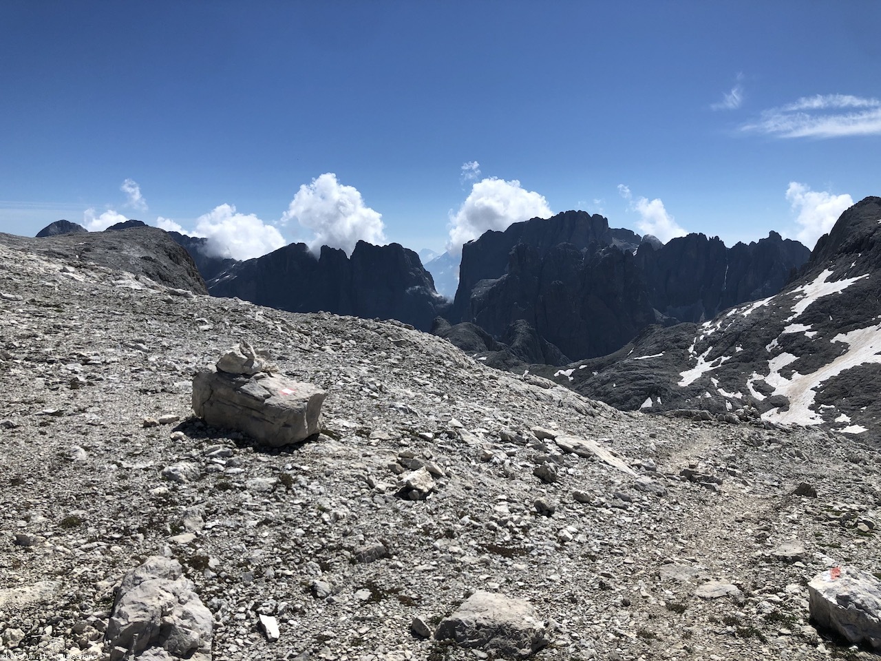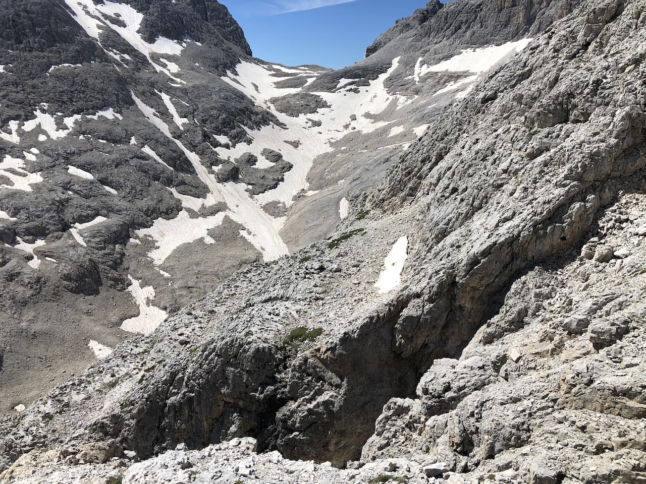 Sguardo retrospettivo. Chiaramente visibile il passo Canali. Dietro il passo, l’Alberghetto. Dietro l’Alberghetto, il Coro. Dietro il Coro, la Croda Granda.