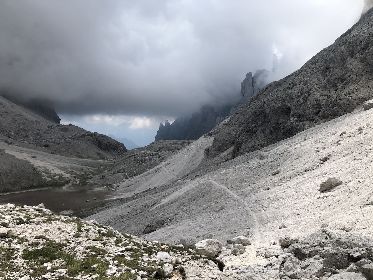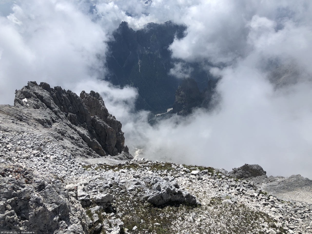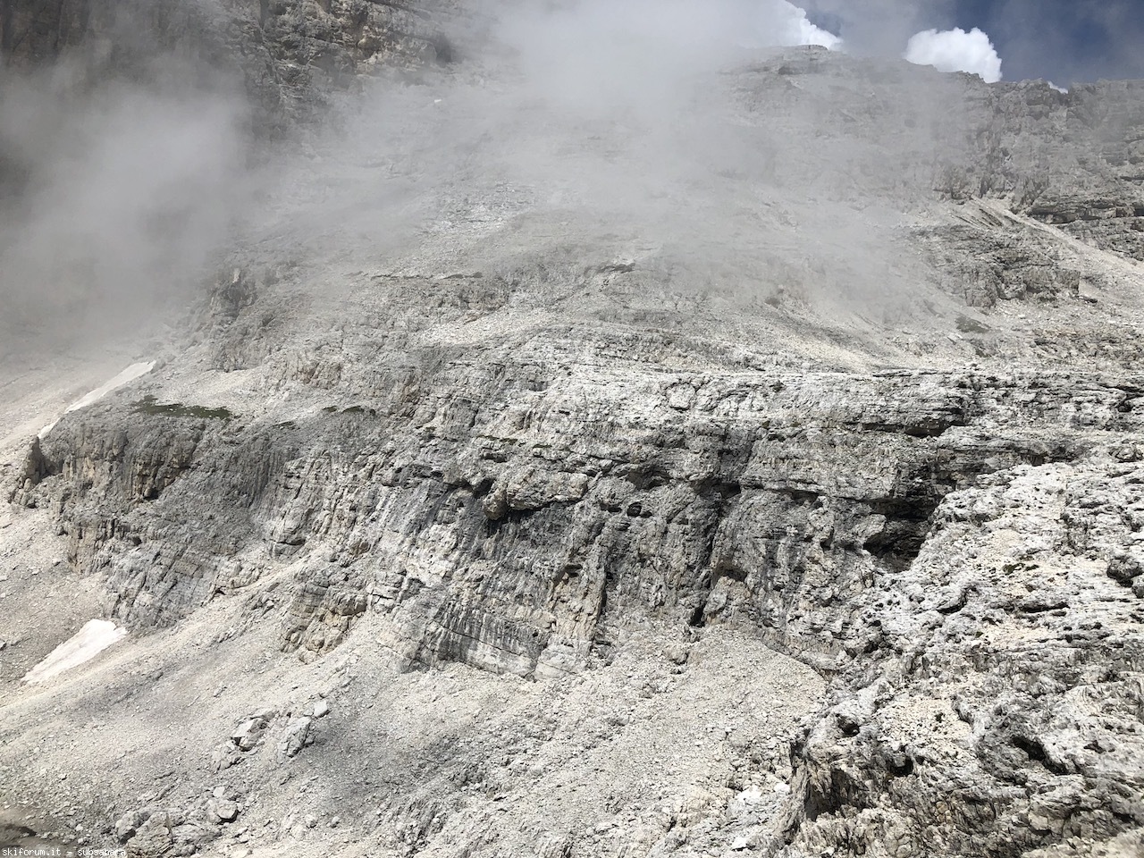 Rimango in vetta solo una decina di minuti... mi sarei mangiato volentieri un panino, ma preferisco scendere e imboccare senza troppi indugi la Val Pradidali, dove l’eventuale scarsa visibilità non mi preoccupa