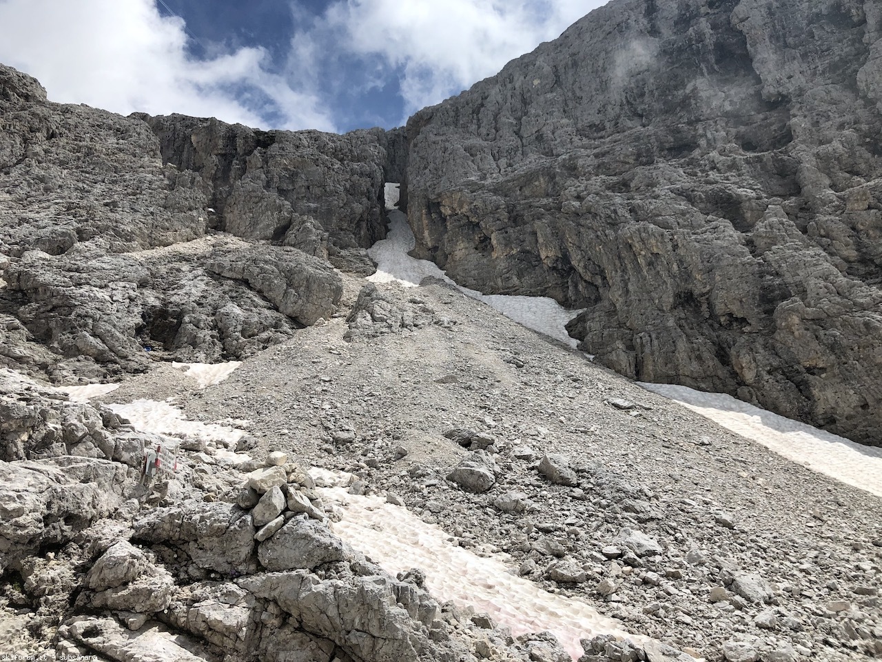Passo della Fradusta, 2680 m slm. Sono le 12:45 e le nuvole purtroppo avanzano. Mi lancio a capofitto in Val Pradidali per il 709A