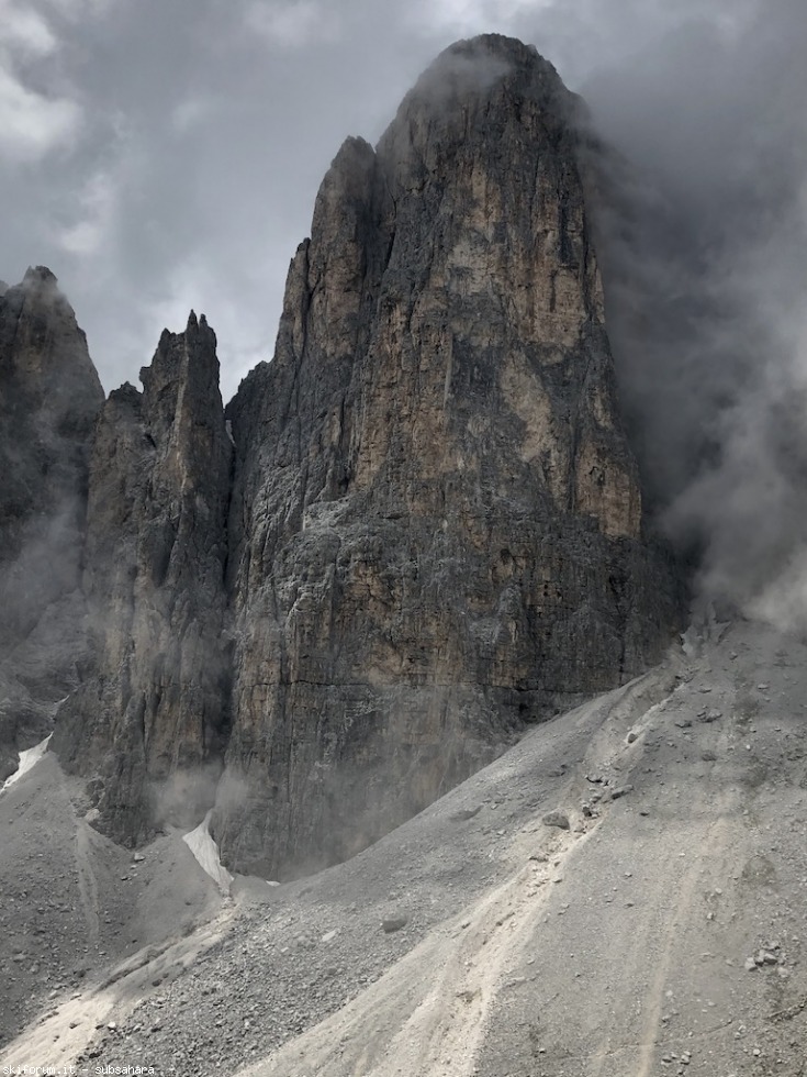Purtroppo la fantastica parete di Cima Canali è completamente avvolta dalle nuvole. Non si vede nulla