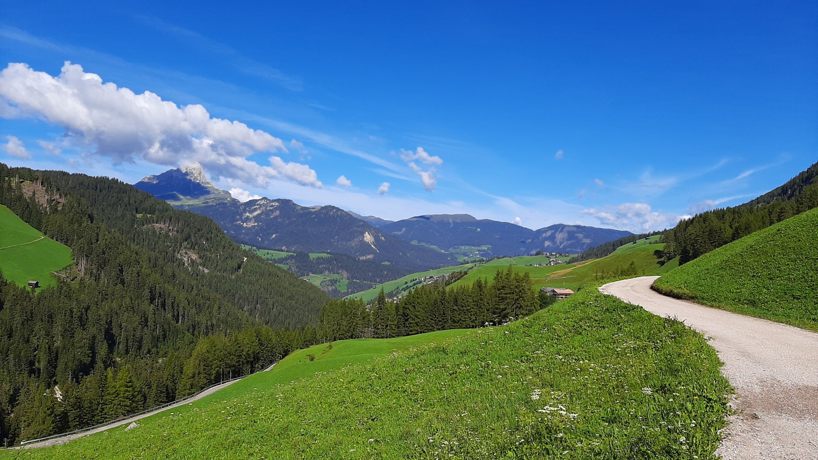 E' la prima volta in bici in questa zona e passo di fianco a strade percorse decine di volte in macchina e spesso in mezzo al traffico. Ma lo sterrato che da Badia porta a La Villa e poi a Corvara è un pò un mondo ovattato che mi consente di trovare scorci inaspettati di pace, bellezza e tranquillità.