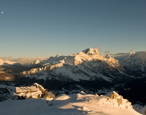 Dal Porta Vescovo abbiamo uno tra i più bei panorami sulla Marmolada, da qui si possiamo osservare i precorsi fuoripista. Guardando verso nord la visuale si apre sulla Val Badia ed il Sella che culmina nella piramide Piz Boè.