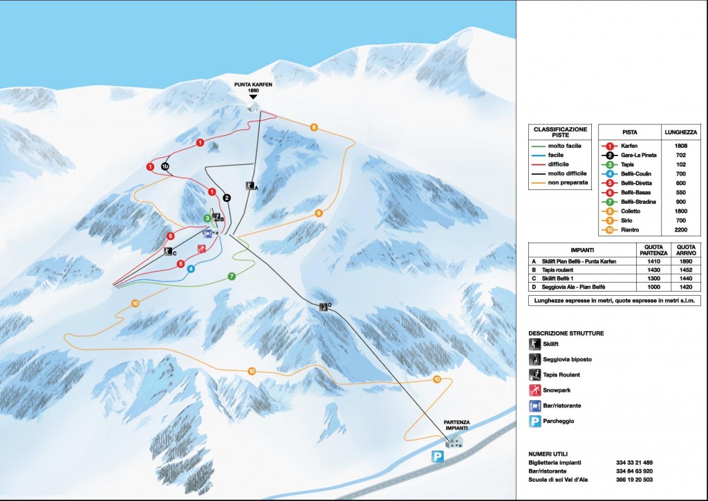 A Punta Karfen, a 1890 metri di quota, vi è il punto più alto del comprensorio di Ala di Stura. Arrivati qui si può scegliere se affrontare un itinerario fuoripista o se scendere verso le altre piste.