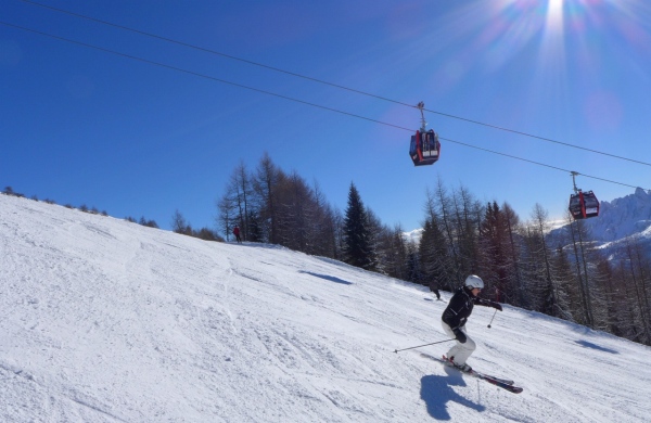 [i]Sciatrice sui pendii iniziali della pista rossa Tre Cime in Alta Pusteria, Dolomiti Superski.[/i]