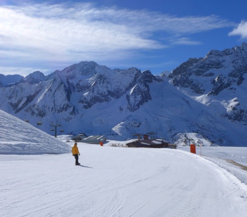 Dopo un primo curvone che aggira il colle su cui sorge il rifugio la pista diventa un bellissimo pendio di media pendenza su terreno vario e mosso sempre perfettamente innevato. Il panorama che si gode da questa parte della pista Bleis è sensazionale.