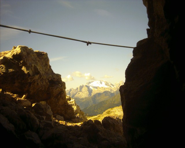 Qui si indossa il set da ferrata e si accede alla galleria tramite alcune scalette a pioli. Il percorso in galleria non presenta difficoltà, se non a chi soffre di claustrofobia, perché offre ben poche finestre, di cui una verso la fine merita perché ci fa vedere che la Regina (Marmolada) ci sorveglia.