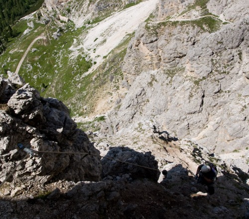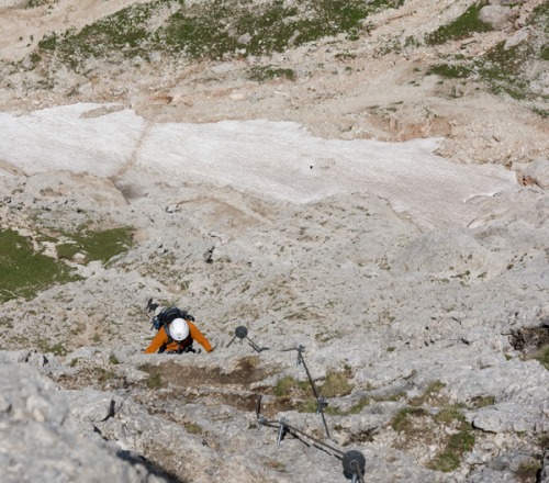La prima parte è molto impegnativa, con scarsi appoggi e piuttosto verticale. A causa di questo si possono creare delle lunghe attese alla partenza ma una volta sorpassato questo "imbuto" la ferrata procedere regolarmente.