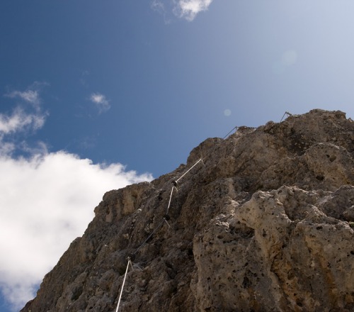Altre difficoltà si incontrano nella parte finale. Poco prima di sbucare sul grande prato finale si affronta un altro salto roccioso piuttosto verticale che però a differenza del primo tratto presenta numerosi appigli ed appoggi per i piedi. Lo si supera senza grosse difficoltà a patto di non soffrire di vertigini, questo è infatti uno dei punti più esposti della via ferrata.
